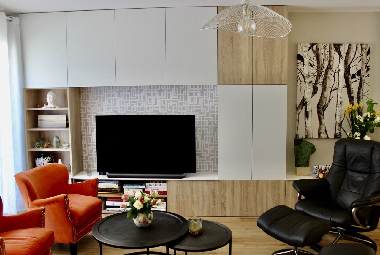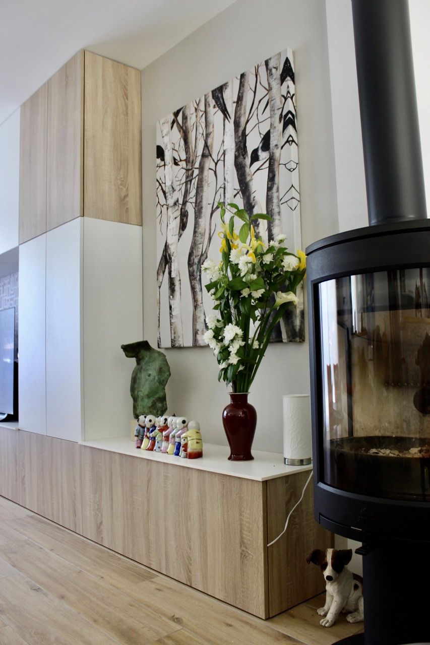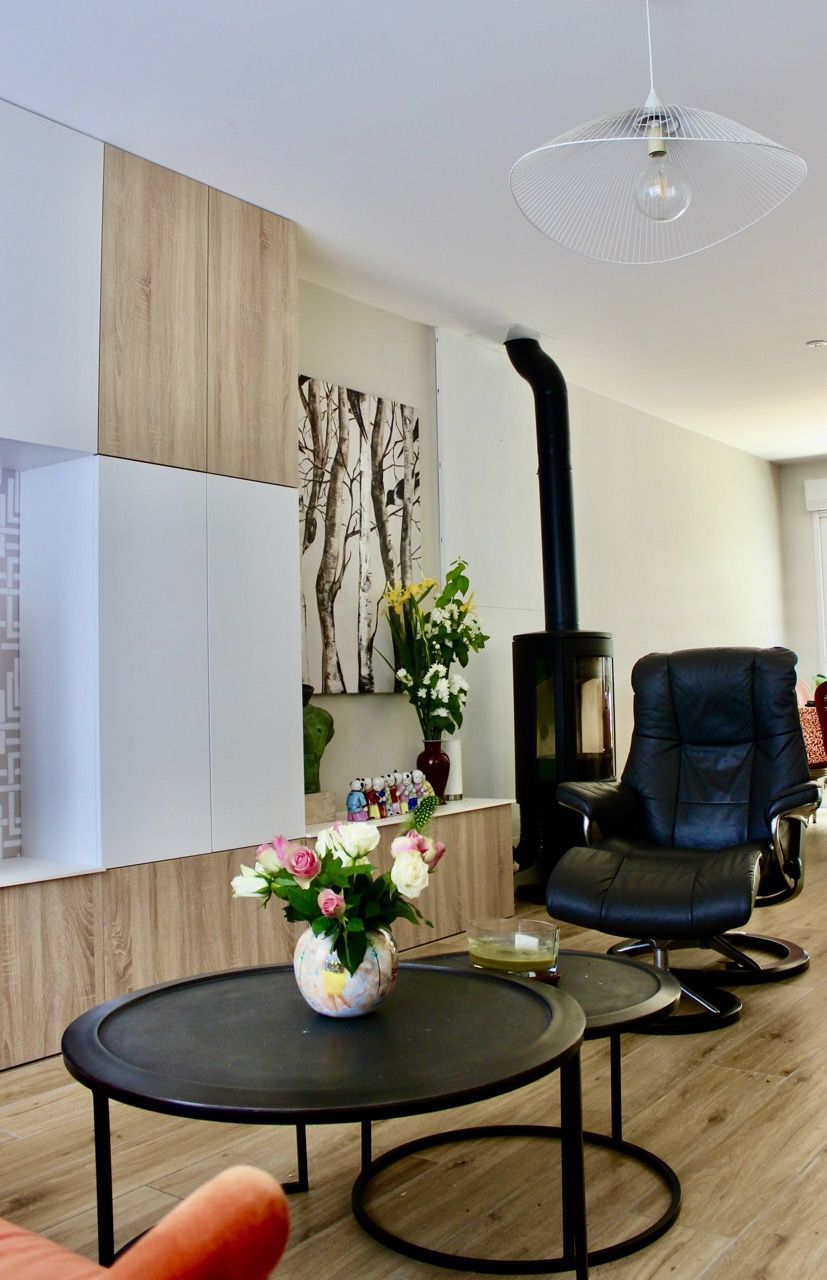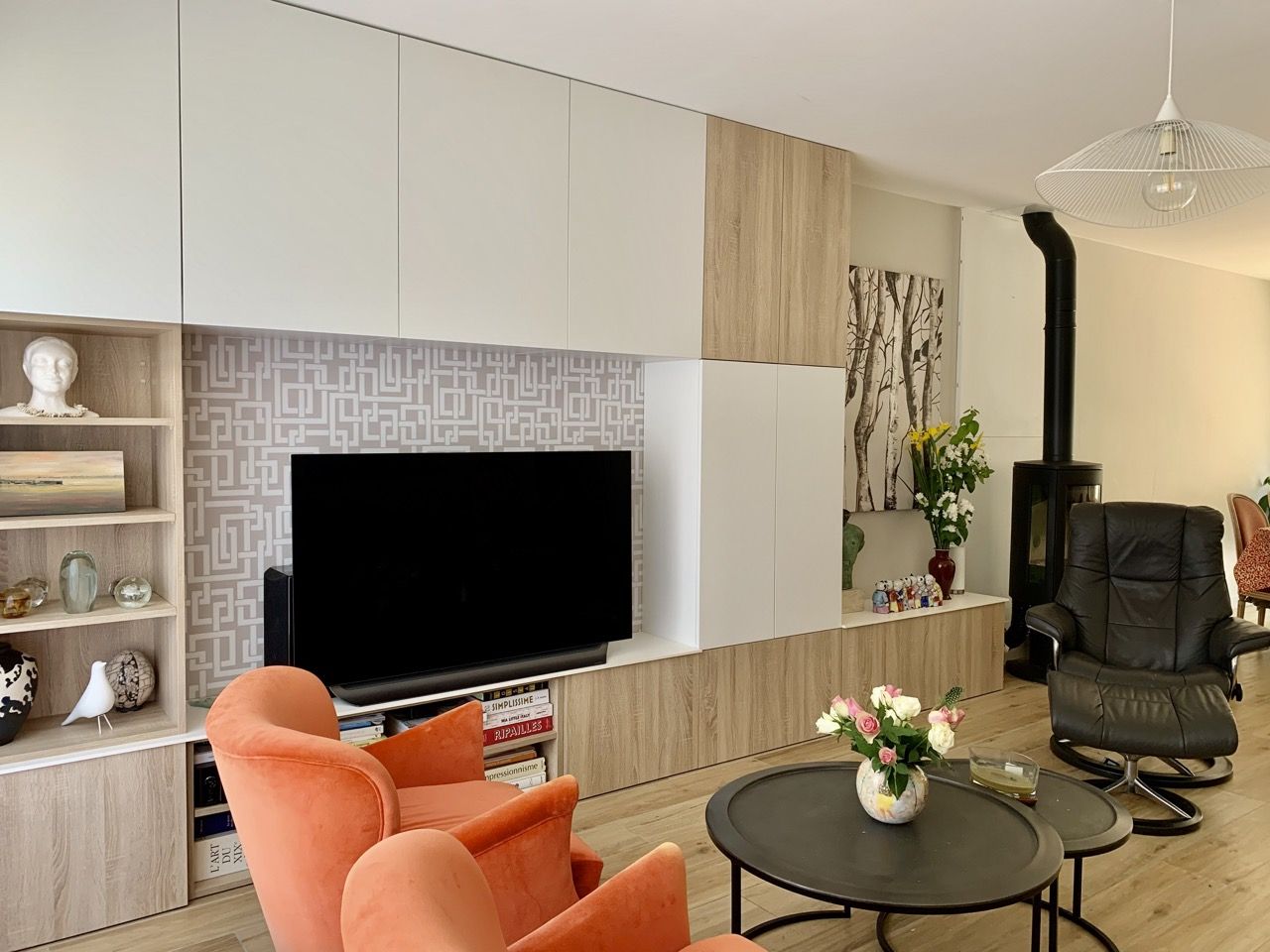 Conception d’un module TV composé de nombreux rangements et d’une banquette pour se réchauffer près du poêle à bois.