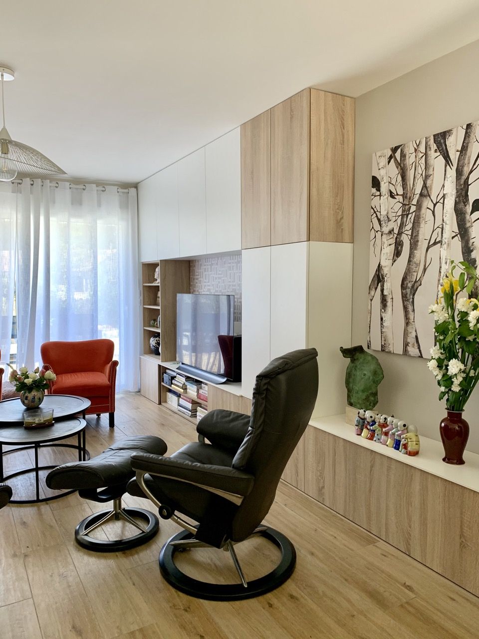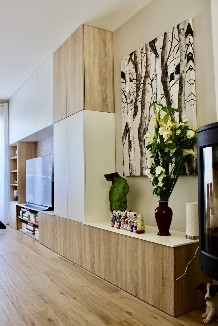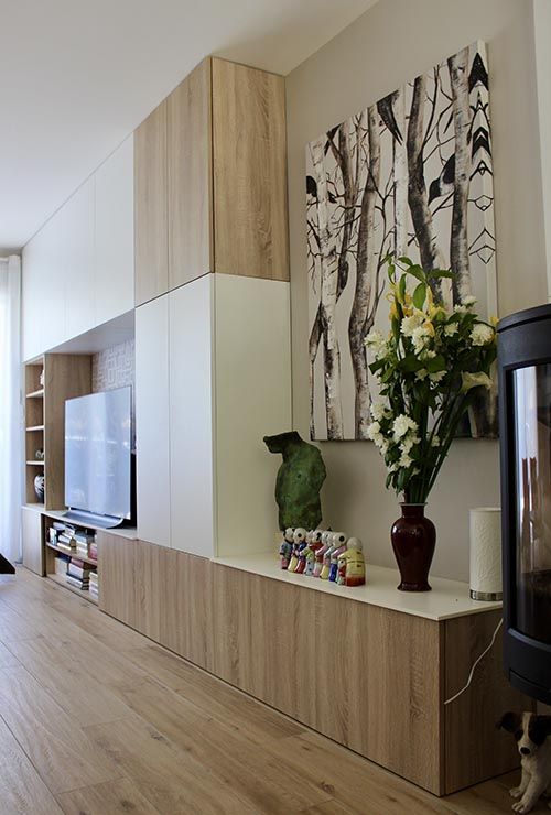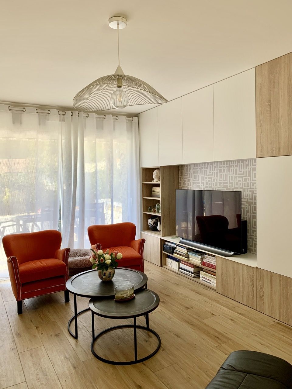 Conception d’un module TV composé de nombreux rangements et d’une banquette pour se réchauffer près du poêle à bois.