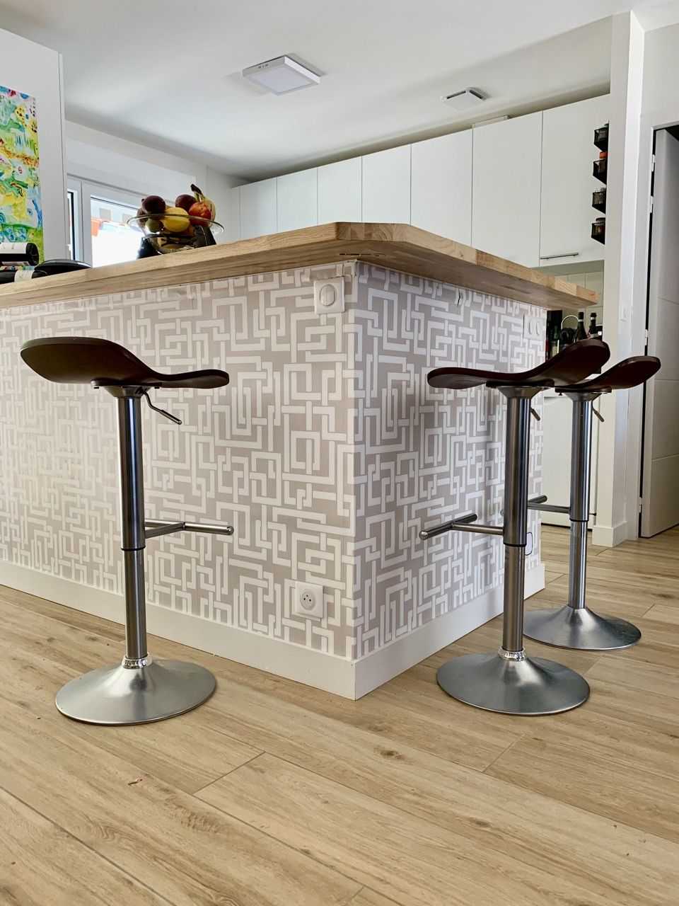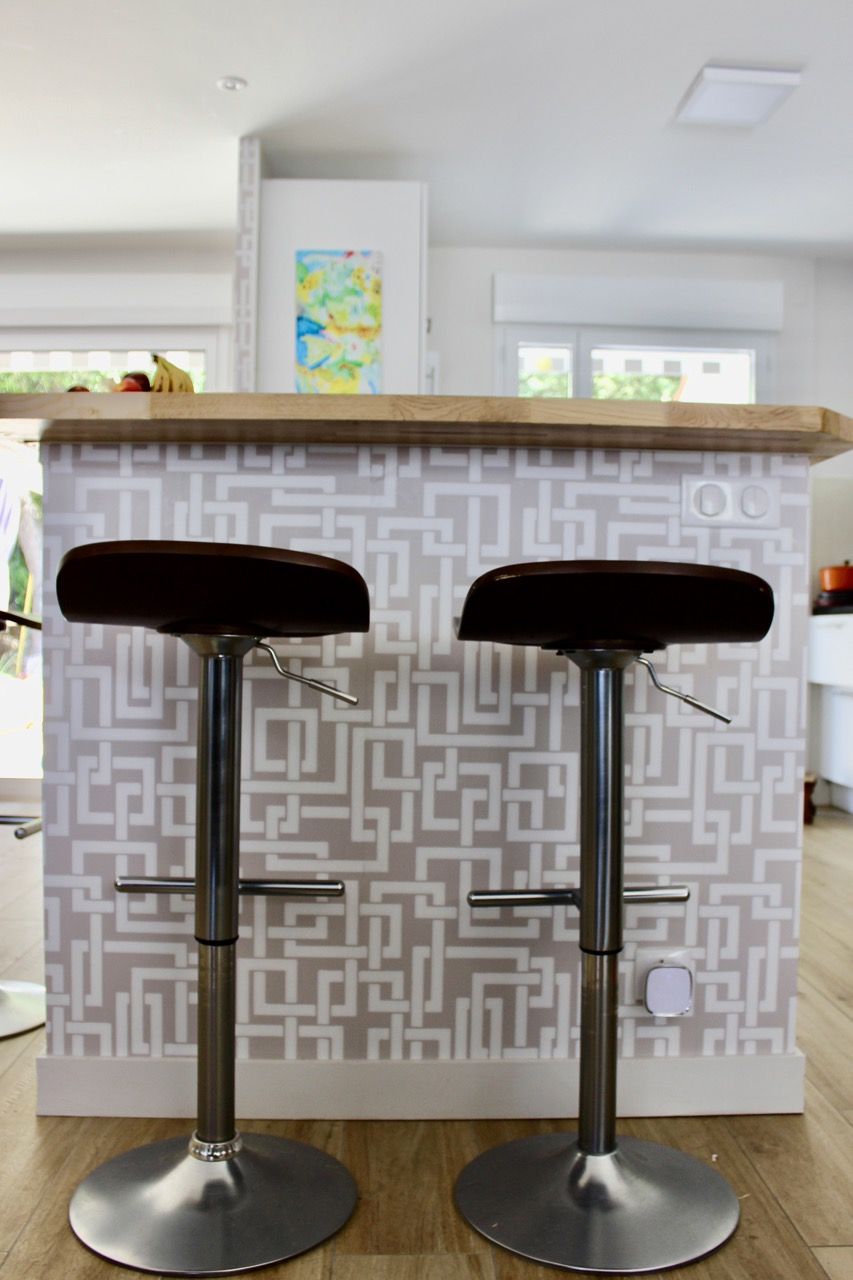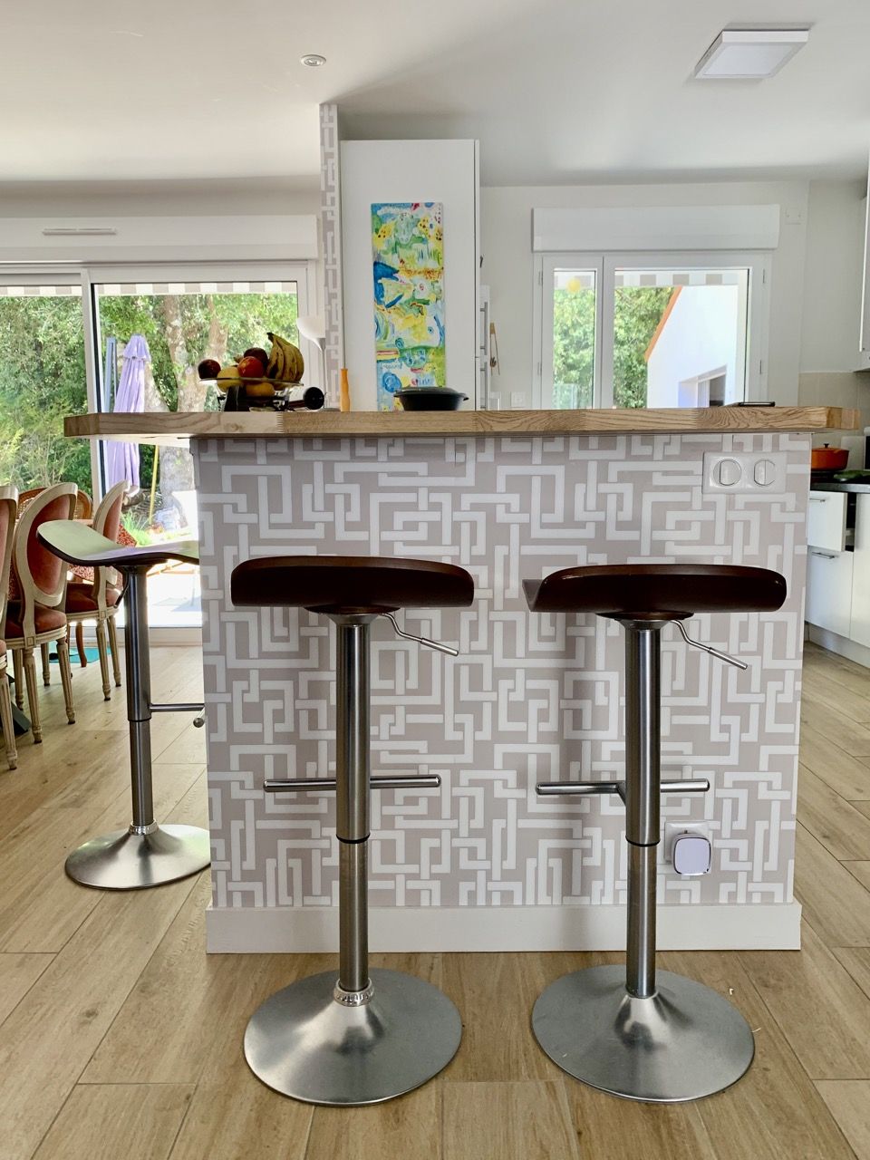 Sélection d’un papier peint de la game Farrow and Ball pour souligner discrètement et graphiquement la ligne du bar et du fond de meuble TV.
