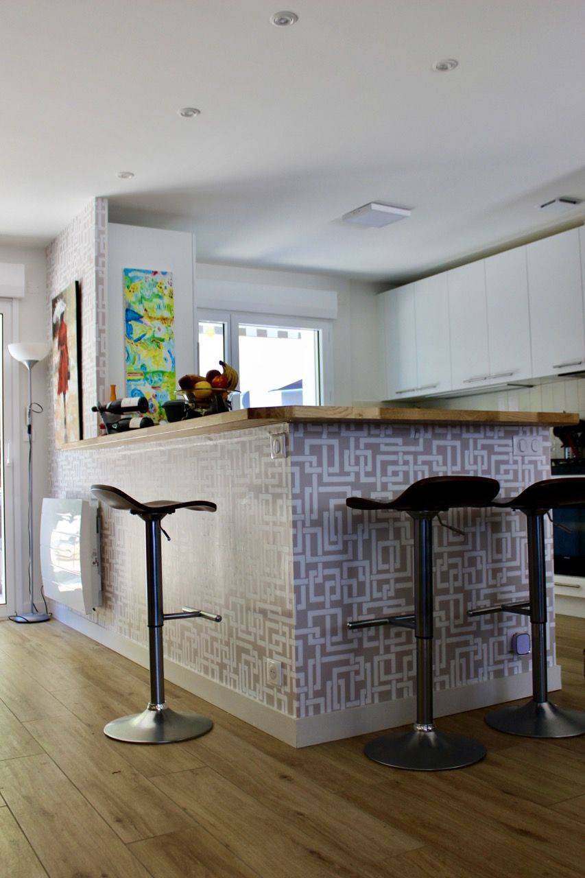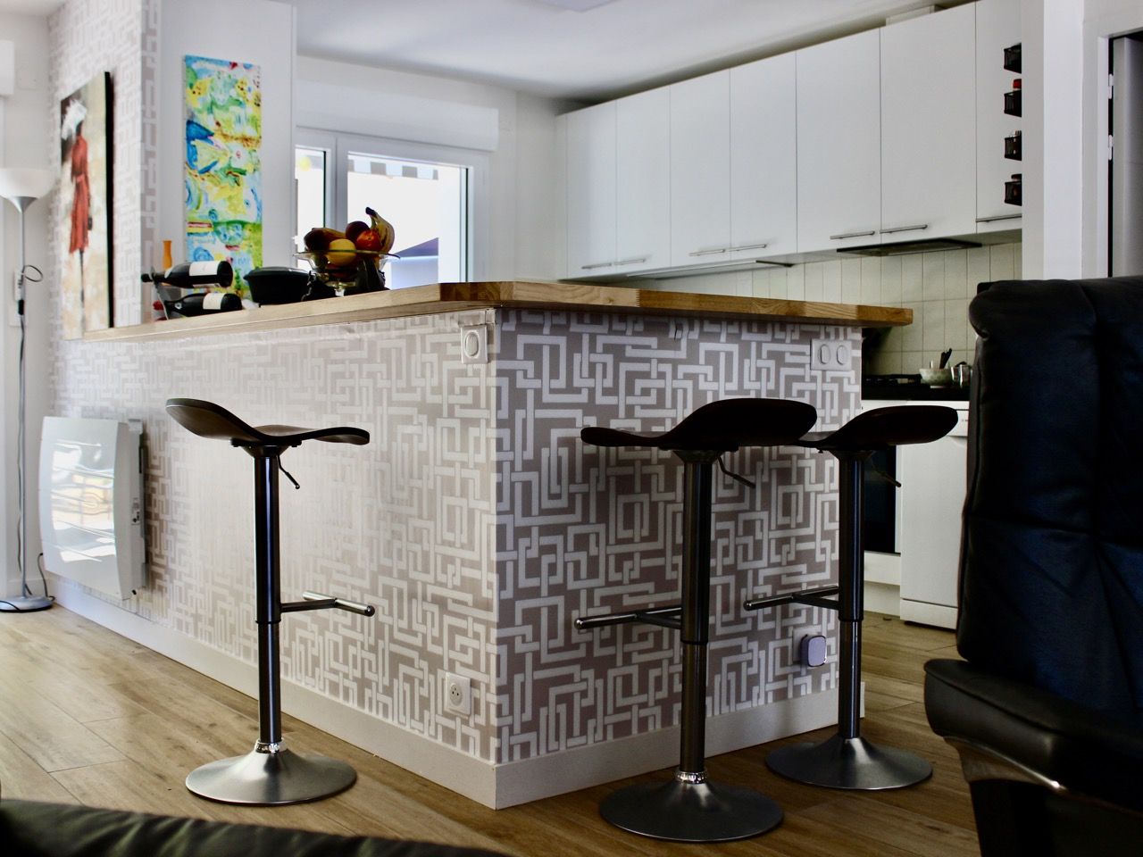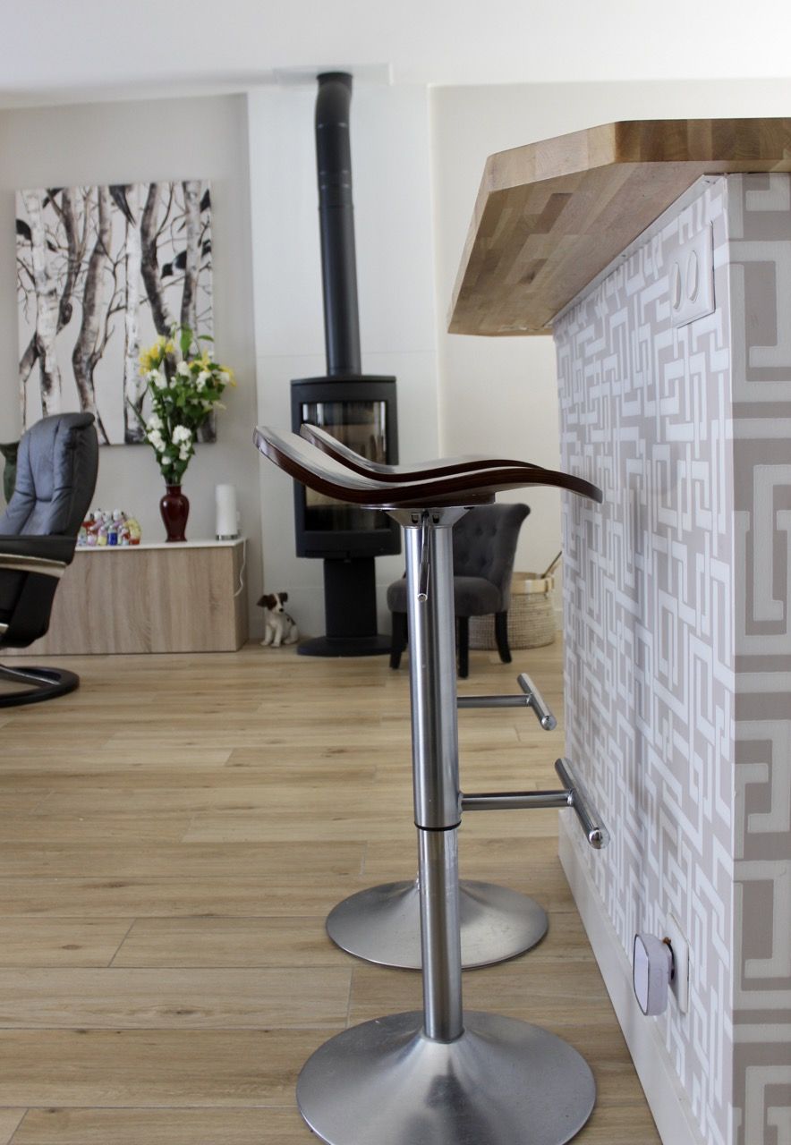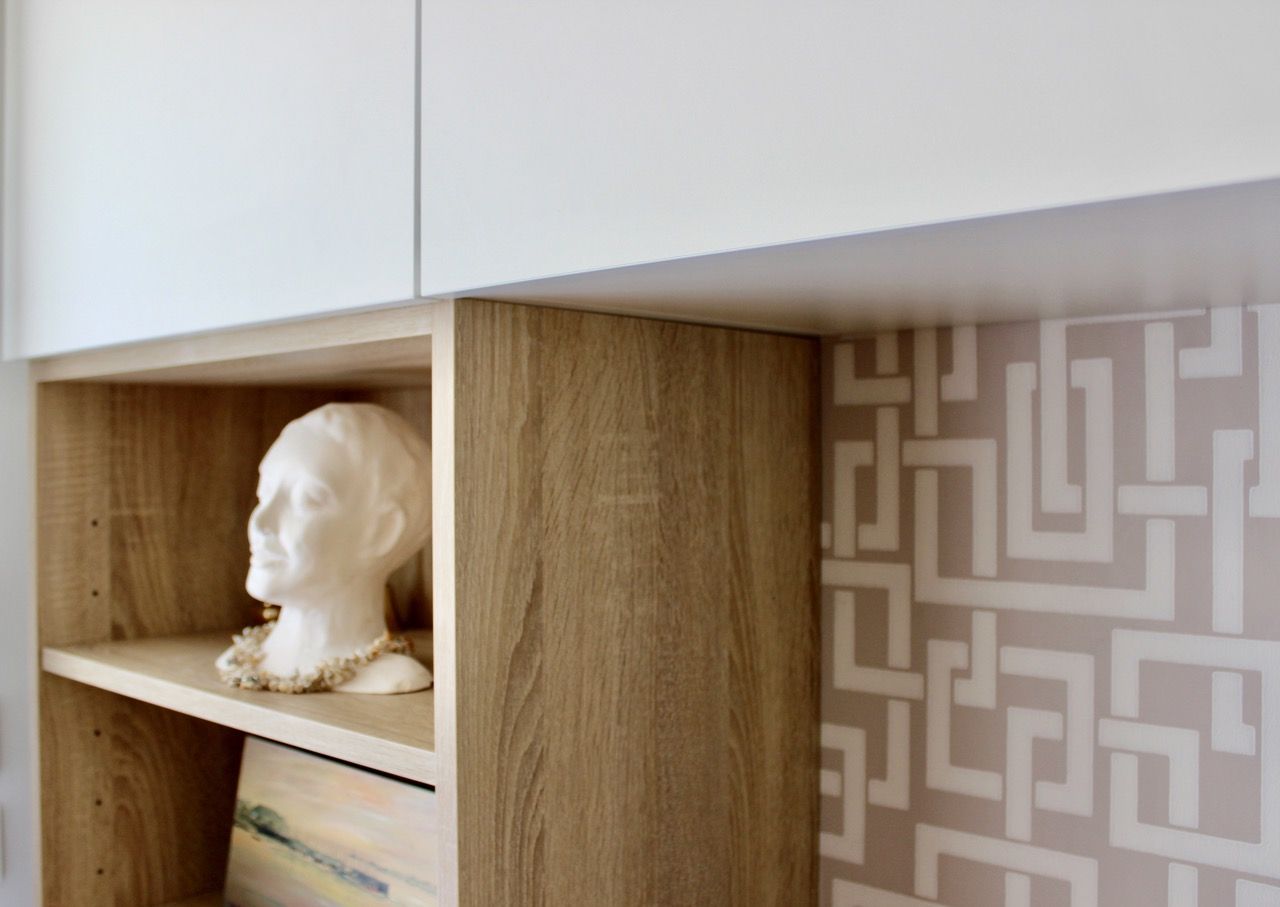 Sélection d’un papier peint de la game Farrow and Ball pour souligner discrètement et graphiquement la ligne du bar et du fond de meuble TV.