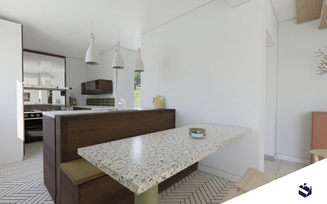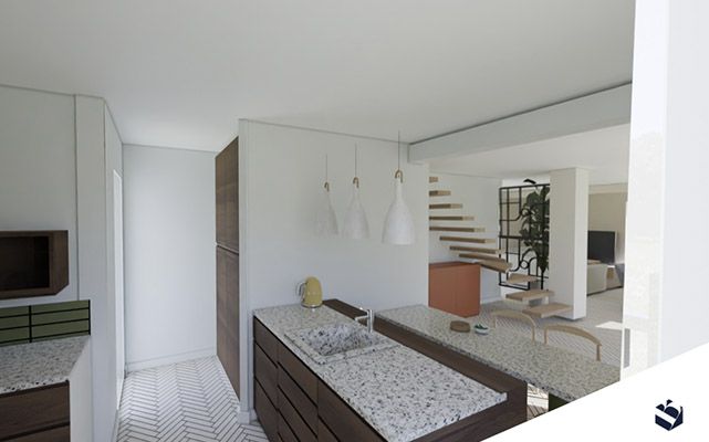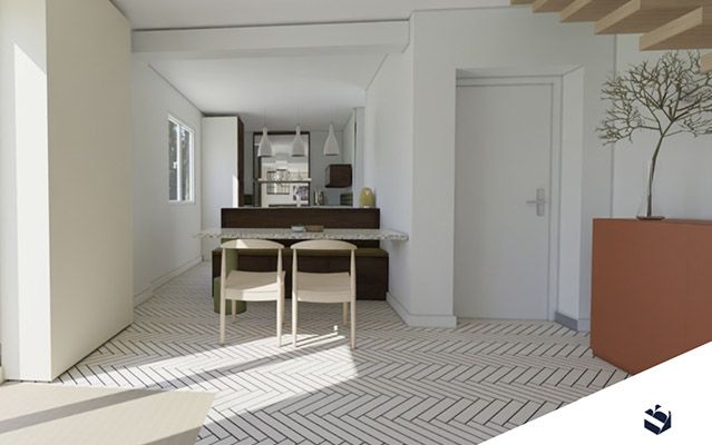Pour ce projet nous avons fait venir du Maroc des bejmats Brut pour une pose en chevrons sur l’ensemble du rez-de-chaussée.